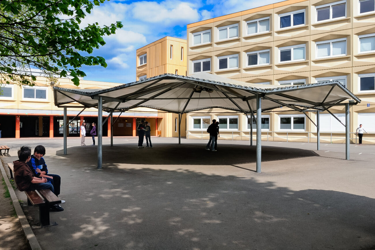 Réalisées sur mesure, esthétiques et faciles à installer, les couvertures de préaux d’école et d'abris d’aires de jeux assurent le confort et la sécurité des enfants. Leur résistance est calculée pour résister dans les conditions climatiques extrêmes. Les toiles PCV sont traitées anti UV et certifiées REACH, sans composant chimique volatiles polluants.